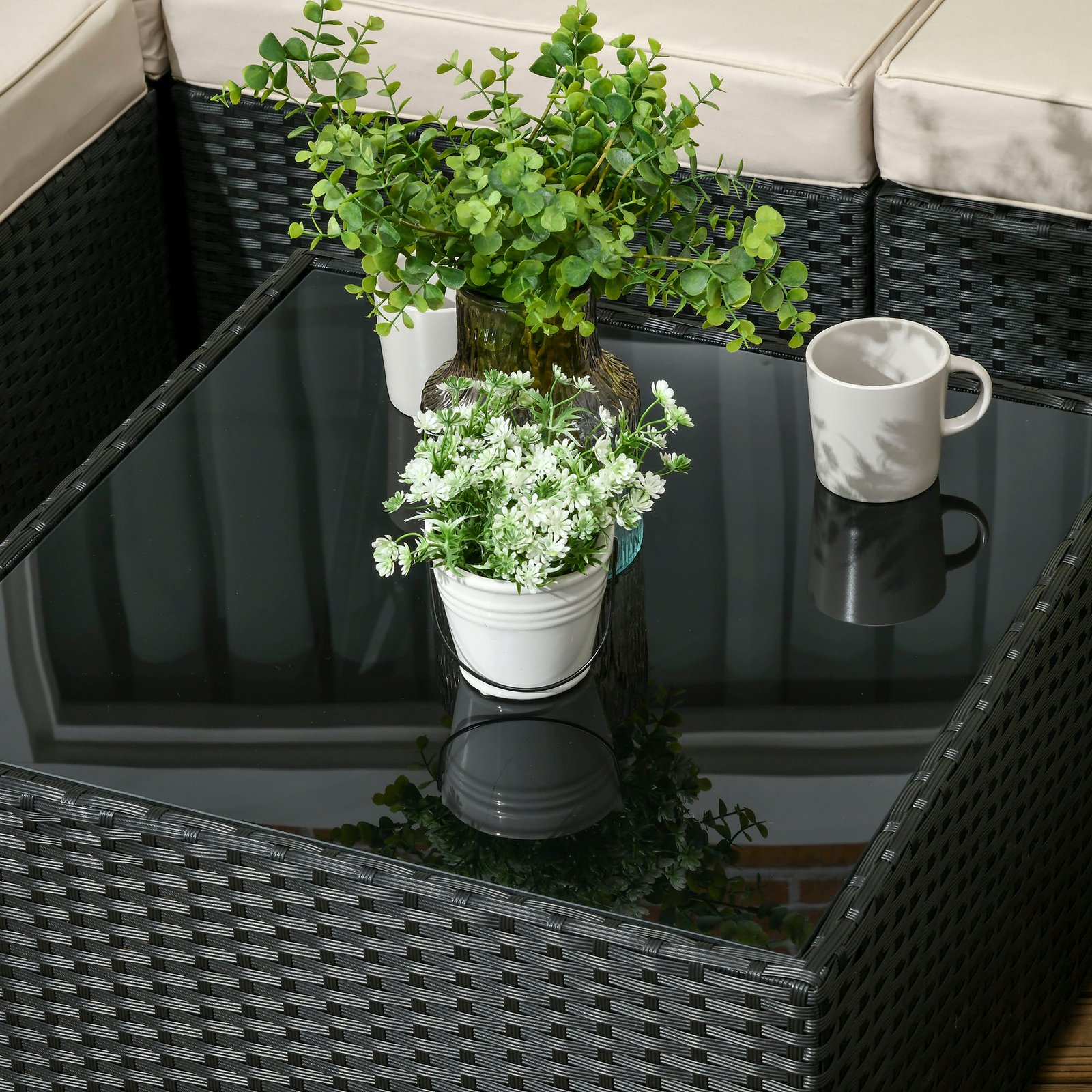 Make your garden stand out like never before. Say hello to this Outsunny garden corner sofa set. Each piece has a steel frame for strong support, wrapped in plastic wicker for double the durability; also creating a forever-stylish set for your outdoor space. Comes with two corner seats, four normal seats, a footstool and table – set up into a shape which you want. Padded cushions for comfort, with four coloured cushions for a touch of bold beauty.