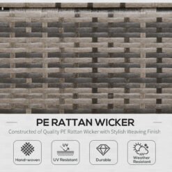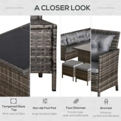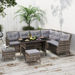 Transform your villa’s outdoor space into a haven with the Outsunny 8-seater rattan sofa set. This exquisite ensemble combines durability with comfort. The rust-resistant metal frame and UV-resistant PE rattan ensure resilience against the elements, while the sleek cushions provide a plush seating experience. Perfect for elegant gatherings, this modern set enhances your garden’s aesthetic, making outdoor time a testament to refined living.