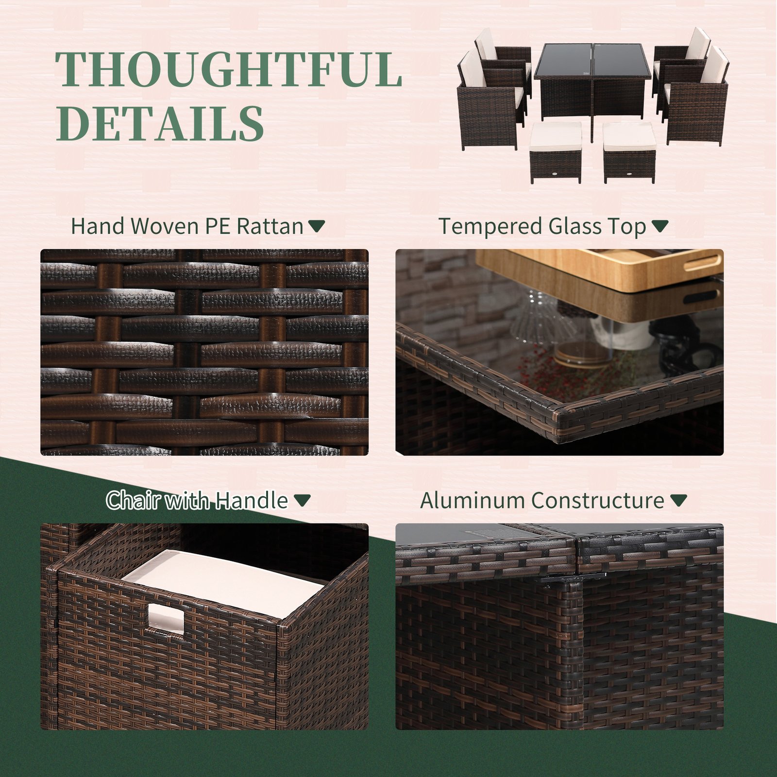 - 9 pieces rattan dining set includes 1 table, 4 chairs and 4 footrests