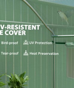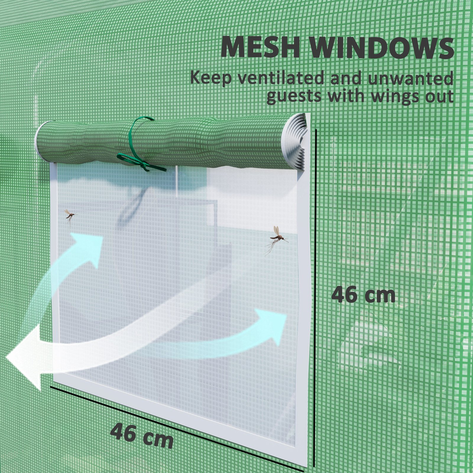 Year-round gardening with plenty of space and protection, with this Outsunny polytunnel greenhouse. Three roll-up doors and multiple mesh windows allow easy access and plenty of fresh air. Fitted with a 140gsm plastic cover for a protective shell – shields inside fromlight weather and allows sunlight to pass through for beautiful growth. Complete with four ground stakes and four guy ropes in the package to pin greenhouse to the ground.