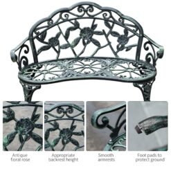 This antique style cast aluminum bench is a great addition to any garden. Made with the latest casting methods of aluminum, and finished with an antique green colour. It has a great rose pattern and a curved front to give added style and comfort. An added feature to any garden which can last for years.