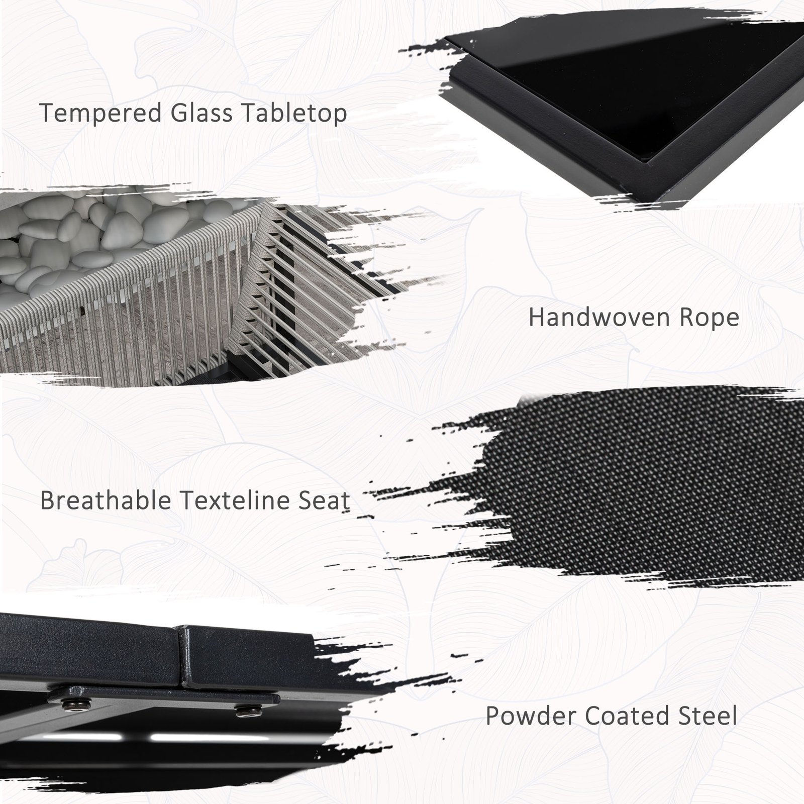 • Glass-top dining table: Tempered for strength to ensure a safe place to dine from. A sleek touch to this garden dining set.