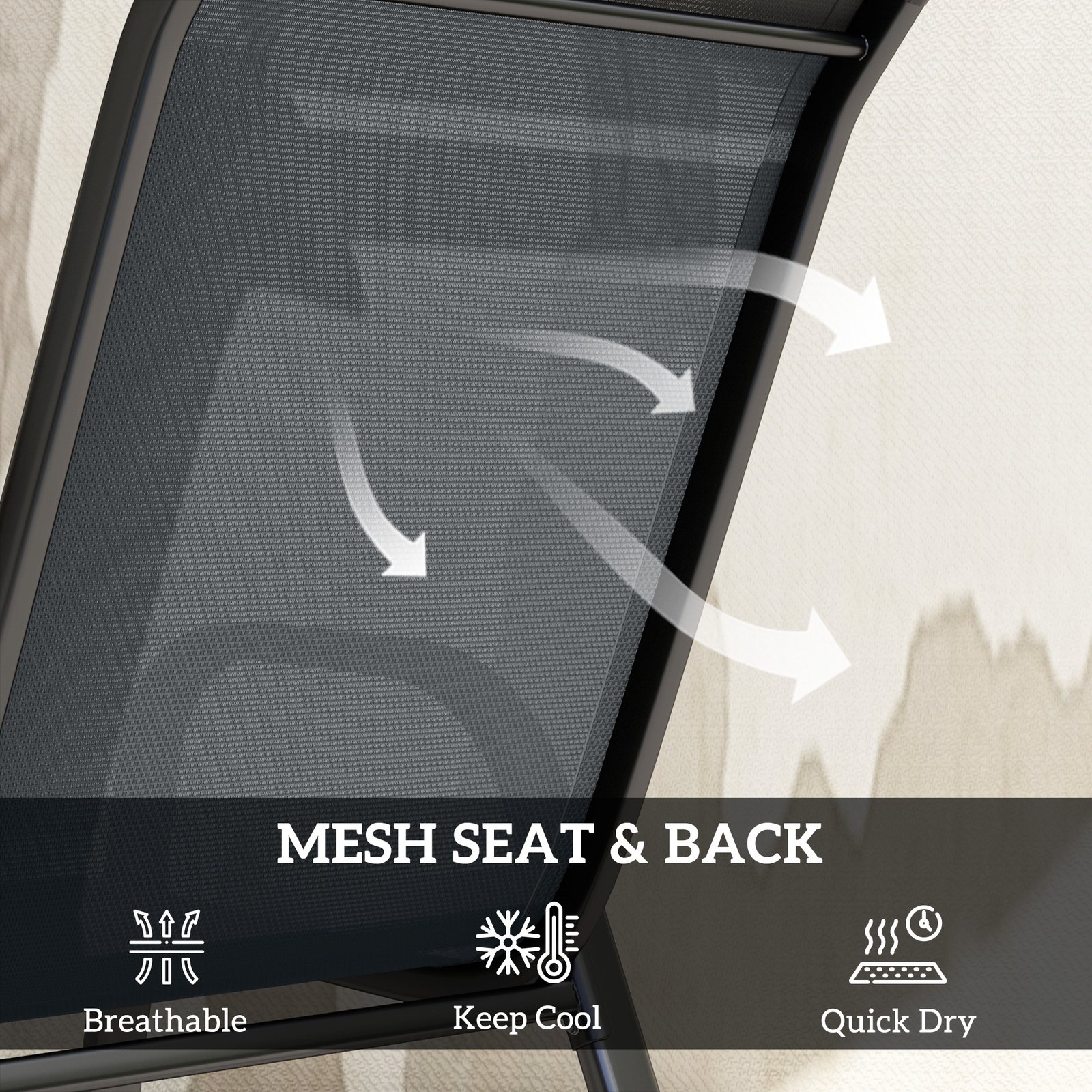 • Mesh seat panels: Sit comfortably on both chairs of this outdoor dining set. Breathable – suitable for hotter days and evenings.