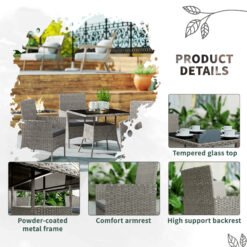 This Outsunny five-piece garden table and chairs are here so you can relax with company. Powder coated steel frames are strong and supportive. Cushions add comfort. The tempered glass tabletop is sleek. This rattan garden furniture set comes with four chairs and a matching table.