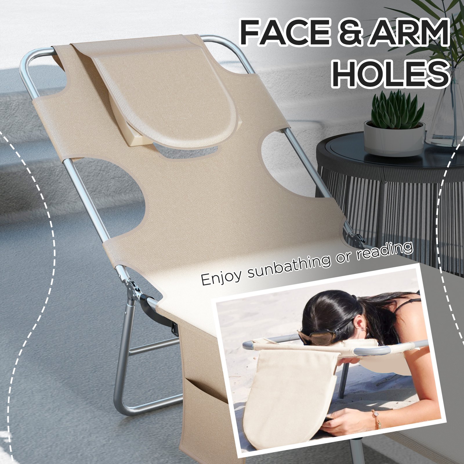 A cool update on the foldable sun loungers from Outsunny. Features a padded head hole at the front to allows you to rest your face in comfortably, which is perfect for relaxing or even reading a book! The powder coated steel frame is strong and solid to support up to 120 kg. The reclining backrest is five positions adjustable, easy to set and lock to a position you like best. Complete with a handy side pocket.