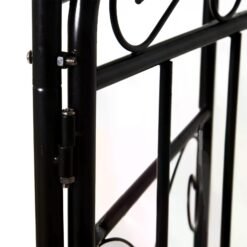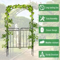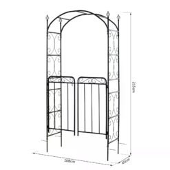 - Made from powder coated metal for a tough and durable structure, able to cope with standing outdoors ? Elegant design combining a tall arch with two doors for a beautiful entrance to your garden and home ? Scrolling all over for a unique look ? Side trellis? allow plants and vines a place to grow against, with rails on the top to hang flowers and baskets for ? allowing you to create a spot full of greenery and colour ? Four spiked legs to push into soft ground, with horizontal metal bars to prevent arch sinking into ground