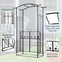 First impressions really do matter, which is why this garden arch gate will tick all the right boxes when guests come over to visit. Using powder coated metal in a matte black finish, the frame is crafted into a tall and impressive design, where trellis on the side provide a place for vines and climbing plants to grow on and around, hanging rails feature on the top for flower baskets and two doors at the front with elegant scrolling all over allow you to get through in the uttermost exquisite manner. Latches on the gate ensure security for peace of mind, and the tall and impressive size of this arch will allow you to create an entrance which is as unique as it is special. Whatever your garden set up, look to this piece for a sophisticated transformation.