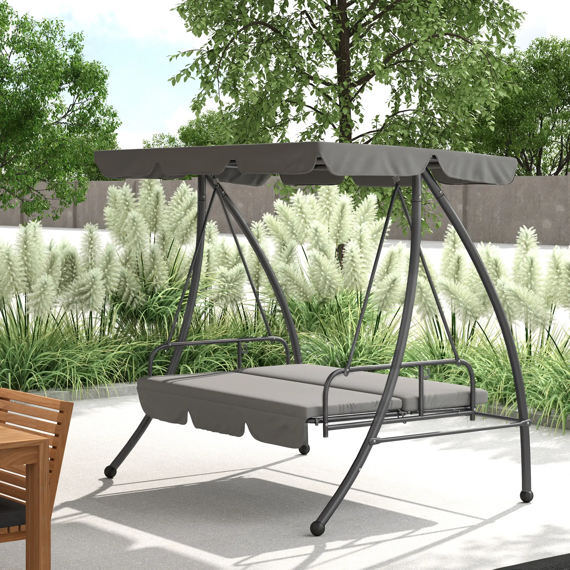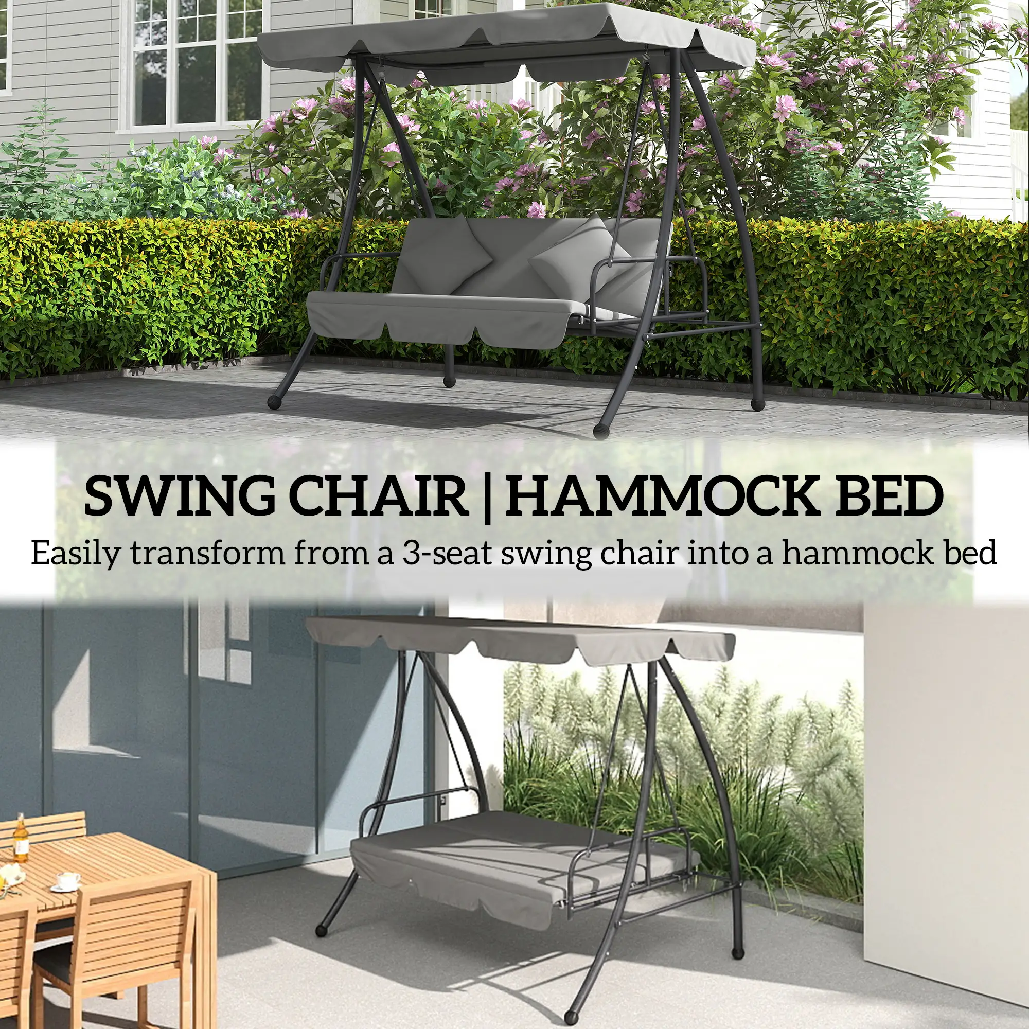 Outsunny Outdoor 2-in-1 Swing Chair Lounger 3 Seater Garden Swing Seat Bed Convertible Tilt Canopy W/ Cushion, Light Grey