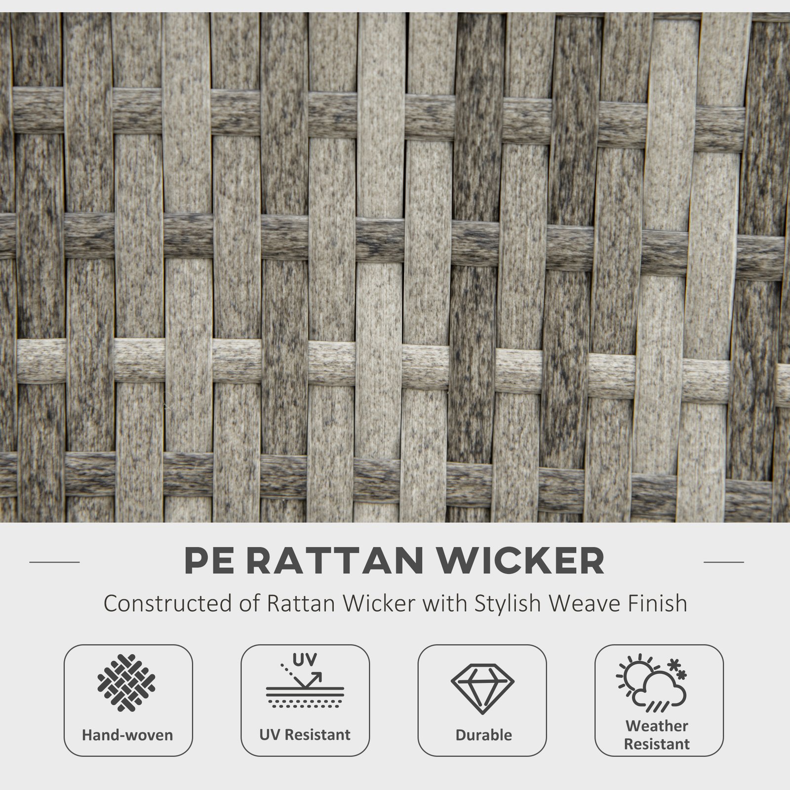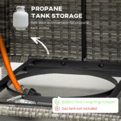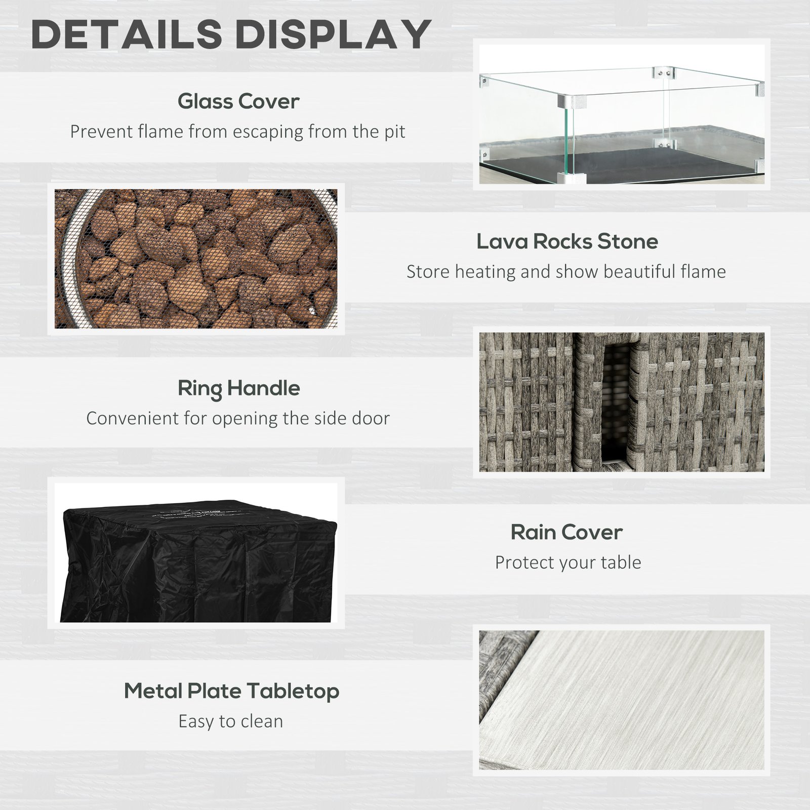 Enjoy garden warmth and ambiance all year-round with this Outsunny fire pit table. Rattan-effect design is stylish, looks great matched with other furniture. The tabletop is fitted with a centre fire pit – the 50,000 BTU burner is powerful and produces a clean smokeless burn. The flame can be adjusted too. The thermocouple closes the valve if the flame goes out for safety – no leaking gas. Complete with a glass guard, protecting against flying sparks.