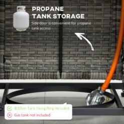 Enjoy garden warmth and ambiance all year-round with this Outsunny fire pit table. Rattan-effect design is stylish, looks great matched with other furniture. The tabletop is fitted with a centre fire pit – the 40,000 BTU burner is powerful and produces a clean smokeless burn. The flame can be adjusted too. The thermocouple closes the valve if the flame goes out for safety – no leaking gas. Complete with a mesh guard, protecting against flying sparks.
