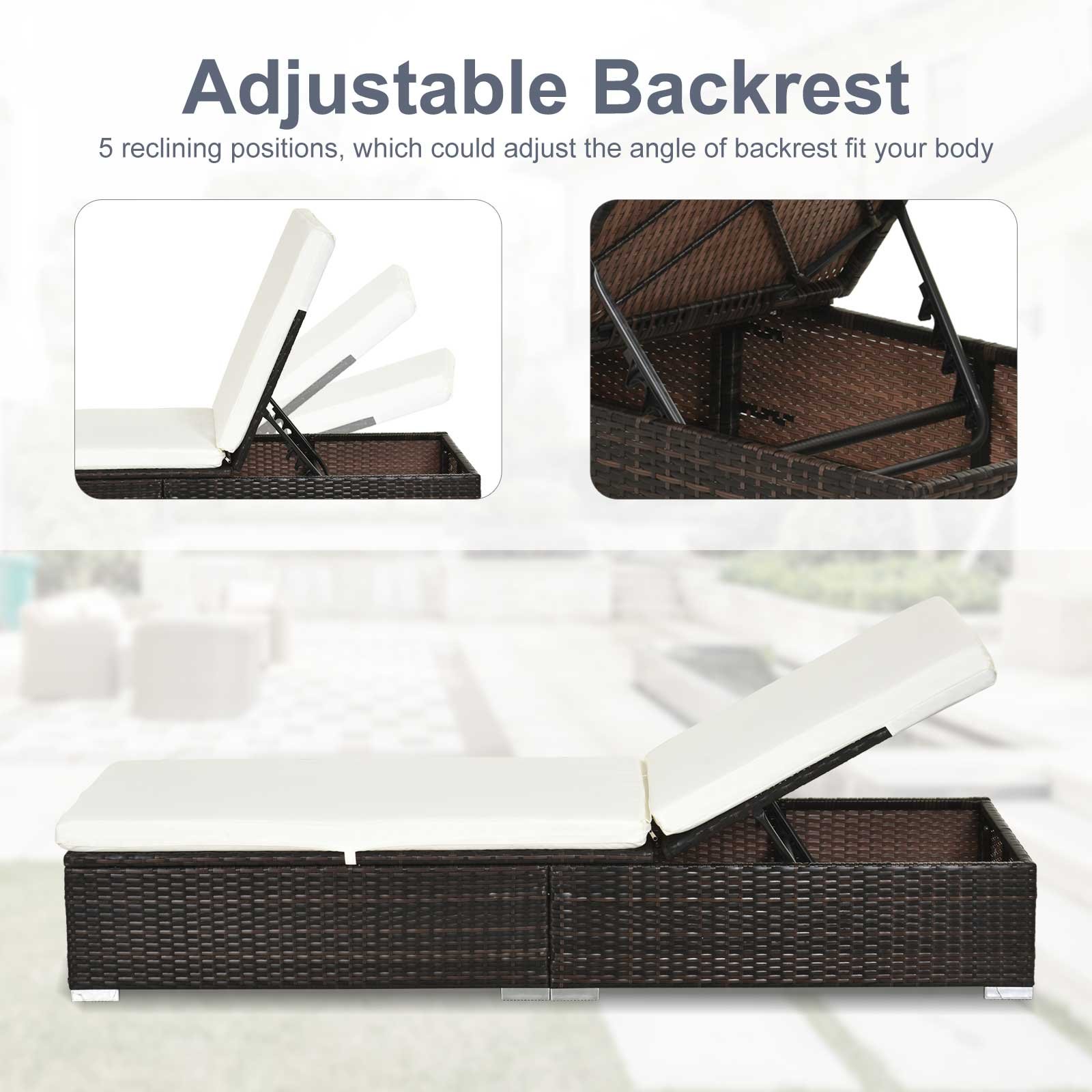• Five-position back: Set the back of this lounger to a position you want. Sunbathe flat or lay back to an upright angle.