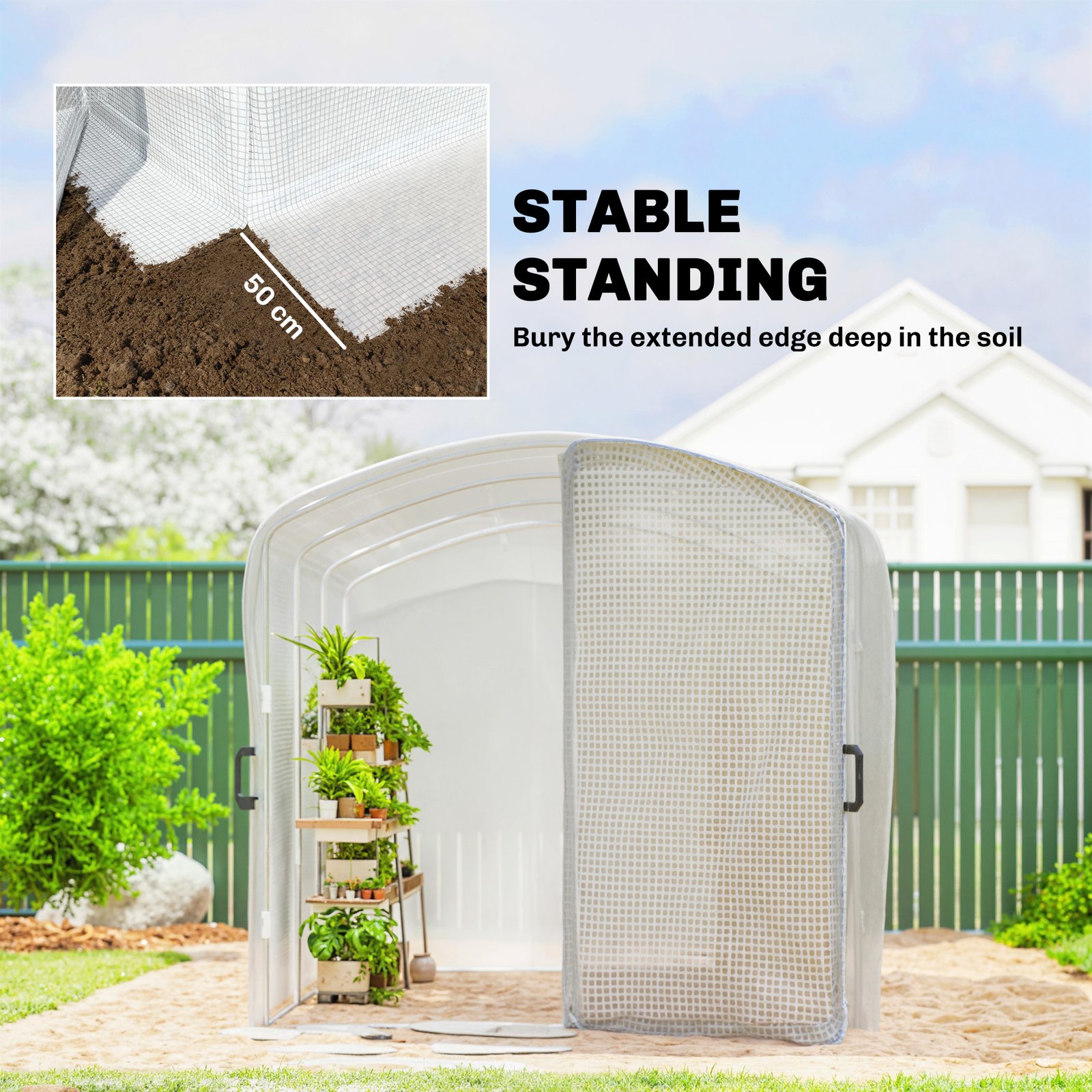 - 50cm edges to bury into soil, keeps greenhouse extra stable