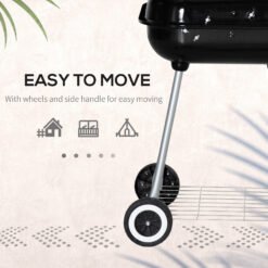 - Portable grill with two wheels and side handle for easy movement