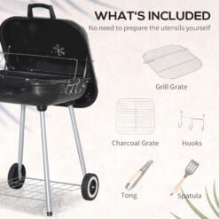 Cook up delicious meals for BBQs, camping trips and more with this portable outdoor charcoal grill from Outsunny. Made with porcelain enamel lid and bowl, it can handle temperatures up to 600, with an adjustable and rustproof damper which provides air circulation and heat control while cooking. The matching grill utensils facilitate your grilling experience and the two wheels allow you to move the grill to where you need it. A great item to bring out on a warm, sunny day!