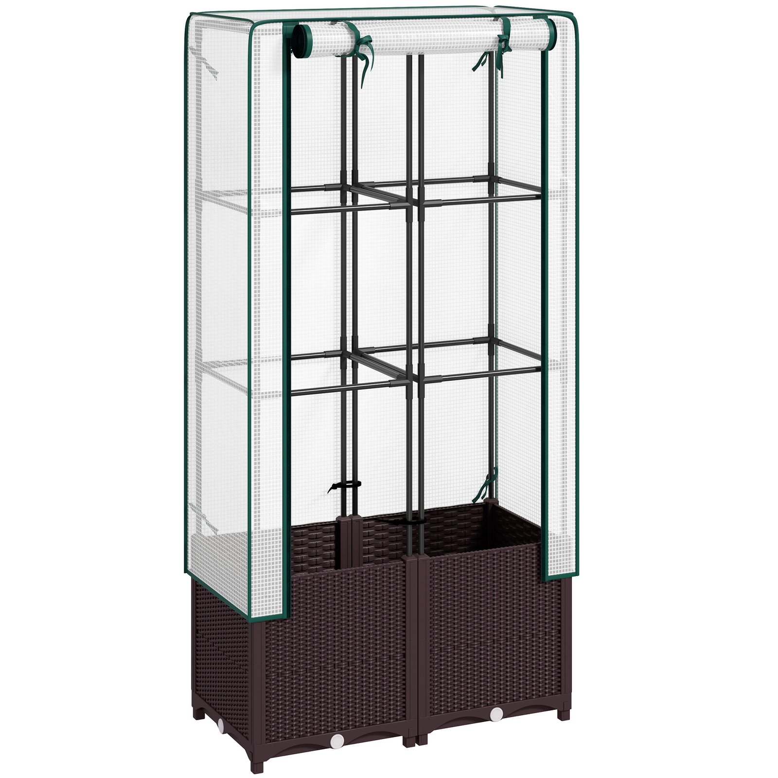 Discover the joys of gardening with the Outsunny Raised Garden Bed! This garden planter includes supportive trellises for your climbing plants and a PE cover to ensure the right humidity and temperature. Its roll-up zip design enhances airflow, making it an excellent choice for your flowers or vegetables. Plus, it’s light enough to move to the desired spot in your garden oasis.