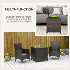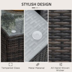 Ensure you have the perfect spot to keep everything you need close to your outdoors, thanks to this side table from Outsunny. Square in shape, it has been made with a powder coated and galvanised steel frame, keeping the structure in check and stable, with PE wicker rattan wrapped on the outside, giving it a versatile look which copes with mild weather damage to ensure it will last in your furniture for many seasons. A 5mm thick tempered glass sits on the top, giving it a sleek look and an even surface which can be cleaned easily. Finished with four legs for balance.