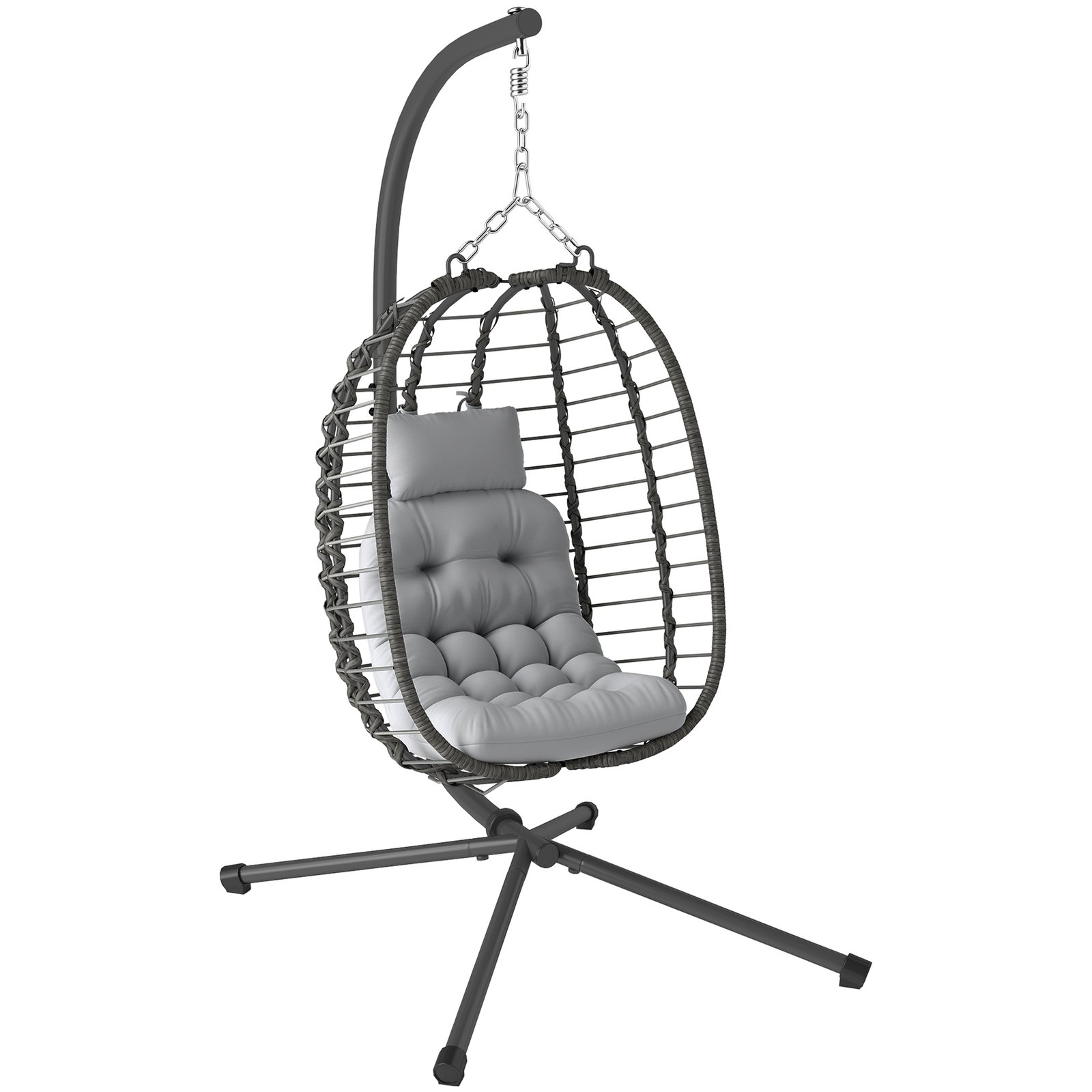 Discover the charm of the Outsunny Rattan Egg Swing Chair, blending style and comfort. Its robust steel frame with chic rattan weaving withstands the elements, while the padded cushion and removable headrest contour to your body for relaxation. Great as a garden swing chair or a cosy indoor retreat, it easily adjusts in height and folds for space-saving storage.