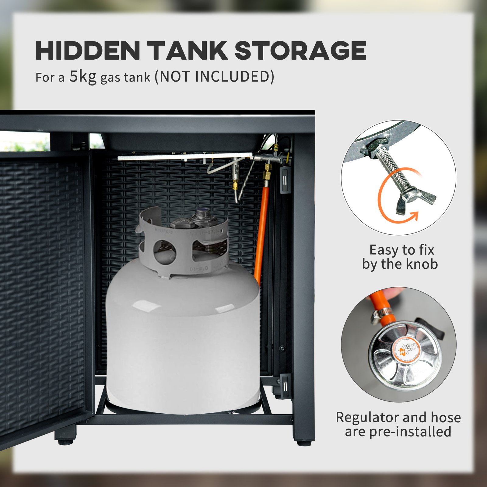 Enjoy garden warmth and ambiance all year-round with this Outsunny fire pit table. Rattan-effect design is stylish, looks great matched with other furniture. The tabletop is fitted with a centre fire pit – the 40,000 BTU burner is powerful and produces a clean smokeless burn. The flame can be adjusted too. The thermocouple closes the valve if the flame goes out for safety – no leaking gas. Complete with a mesh guard, protecting against flying sparks.