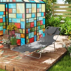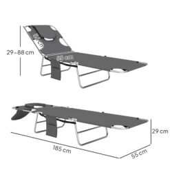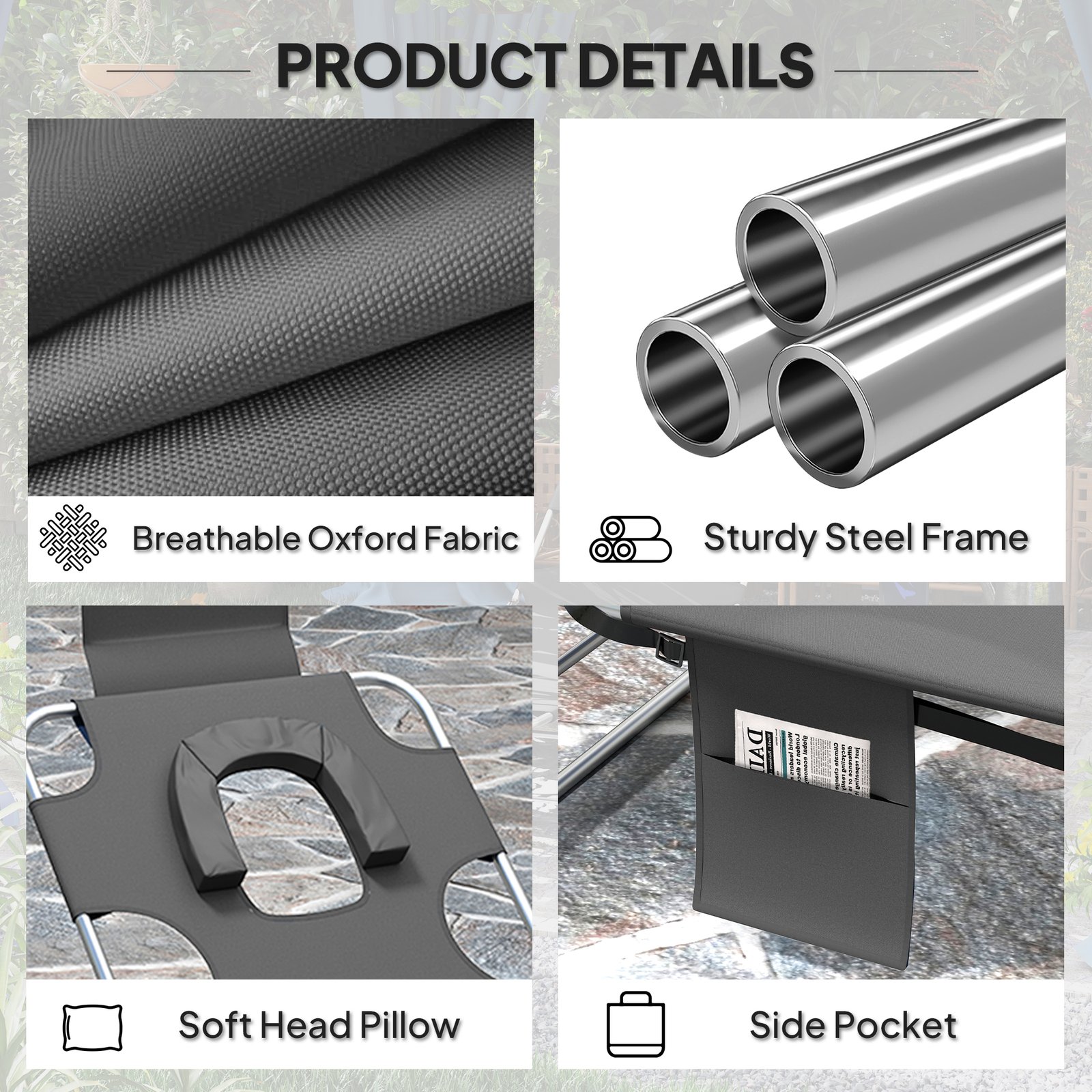 A cool update on the foldable sun lounger from Outsunny. Features a padded head hole at the front to allows you to rest your face in comfortably, which is perfect for relaxing or even reading a book! The powder coated steel frame is strong and solid to support up to 120 kg. The reclining backrest is five positions adjustable, easy to set and lock to a position you like best. Complete with a handy side pocket.