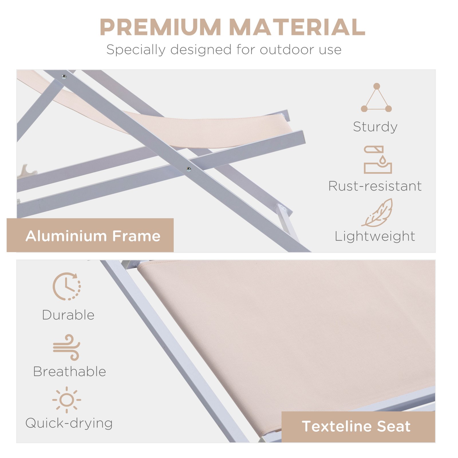 Be ready for the warmer weather as it fast approaches with this set of two garden sun loungers from Outsunny. Although lightweight to move around easily, the outdoor recliner chair is steady and tough, handling up to 160 kg in weight, with a five-position adjustable back, so you can lean back to an angle that suits. Made from texteline, the seats allow your skin to breathe to cope during the hotter weather, whilst ensuring youll be resting comfortably by distributing your weight evenly.
