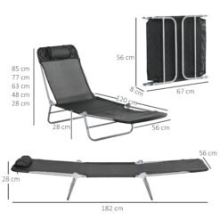 • Dimensions: 28H x 182L x 56Wcm. Folding: 8H x 67L x 56Wcm. Seat height: 28 cm. Maximum load 120kg.