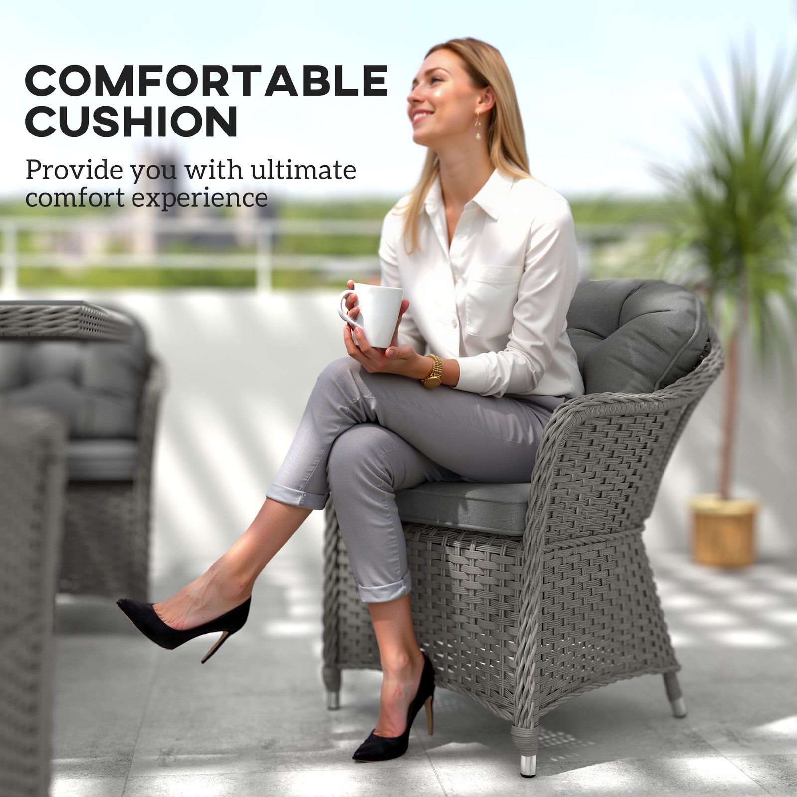 • Comfortable: Thick seat and back cushions on the chairs in this garden dining set – sit and dine all afternoon. High backs and armrests for support.
