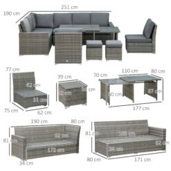• Seven-piece rattan garden sofa set: Formed of a three-seater corner sofa, a three-seater sofa, two chairs and dining table. Freestanding pieces to set into a shape you want. Seats ten.