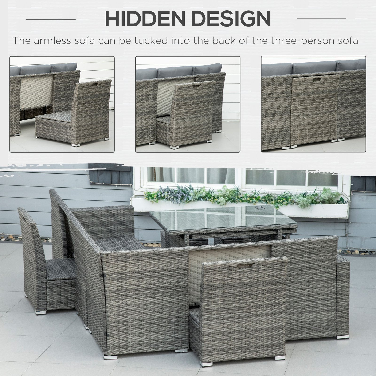 • Nesting chairs: The armless chairs can be tucked into the back of the three-seater sofa. Saves space and keeps your garden tidy.