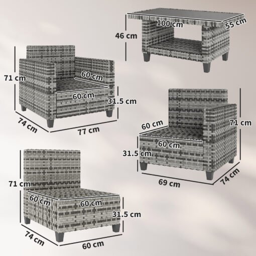 Favourite company gathers round and relaxes in comfort, with this Outsunny six-piece garden sofa set. It comes with two corner chairs, a middle chair, two armchairs and a coffee table – a modular set so you can fix to any shape or position you want. Powder coated steel frames mean a strong core, wrapped in plastic wicker for a stylish and robust rattan look. Complete with seat and back cushions for comfort.