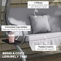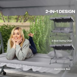 The Outsunny garden swing bench seamlessly fits any garden, balcony, or porch. Constructed from powder-coated steel, its tiltable backrest transforms the frame into a cosy sun lounger. Equipped with an adjustable-angle polyester canopy, it ensures a shaded area is always available.
