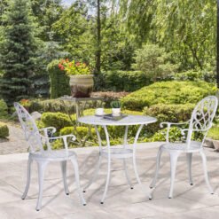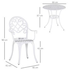 Easy elegance for the outdoors with this Outsunny three-piece garden bistro set. Comes with two chairs and a matching round table – sit with company. Made from aluminium, the garden table and chairs are strong pieces, which are suitable for outdoor use. Complete with adjustable feet to keep the pieces balanced.