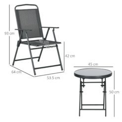 This Outsunny set comes with a round table and two matching chairs – enjoy time outdoors with company, practically anywhere. Powder coated metal frames mean strong cores to support you. Each piece is foldable – easy to carry and store away. The table is fitted with a tempered glass top – a sleek and safe finishing touch.