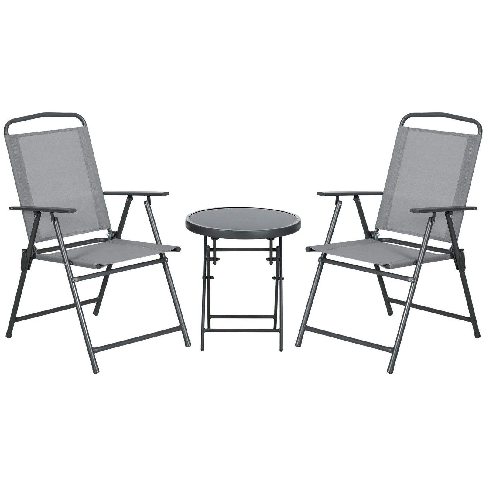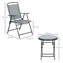 This Outsunny set comes with a round table and two matching chairs – enjoy time outdoors with company, practically anywhere. Powder coated metal frames mean strong cores to support you. Each piece is foldable – easy to carry and store away. The table is fitted with a tempered glass top – a sleek and safe finishing touch.