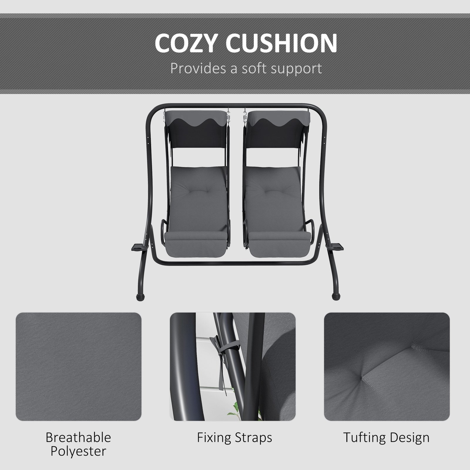 Double the outdoor fun with this two-seat garden swing with canopy from Outsunny. Both swing seats for adults seats come with a cup holder so you can enjoy your favourite drinking whilst soaking up the sun. The curved steel frame is durable and sturdy, with a large base so it keeps balanced. You’ll cherish your summer days even more now with this garden swings for adults.