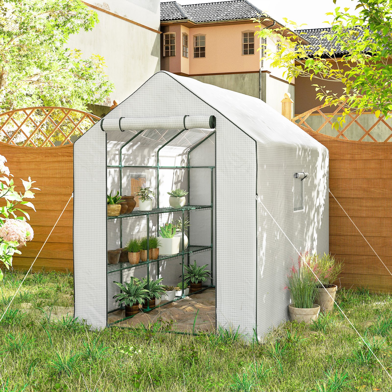 This Outsunny small plastic greenhouse with shelves is suitable for gardeners of all levels. With the UV-resistant plastic cover, roll-up door and three mesh windows, it is a safe shelter inside, allowing you to create a desirable temperature and humidity for total control. Four shelves on each side allow room for holding and organising pots and trays.