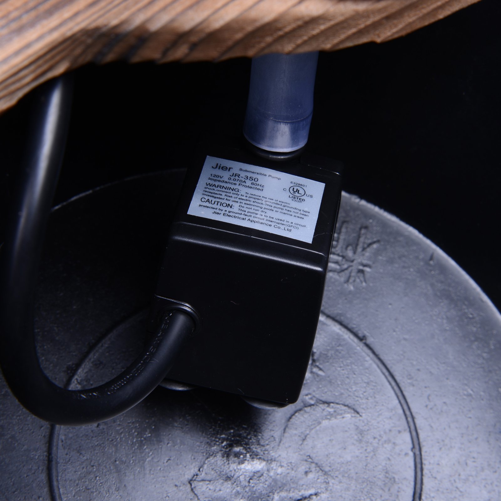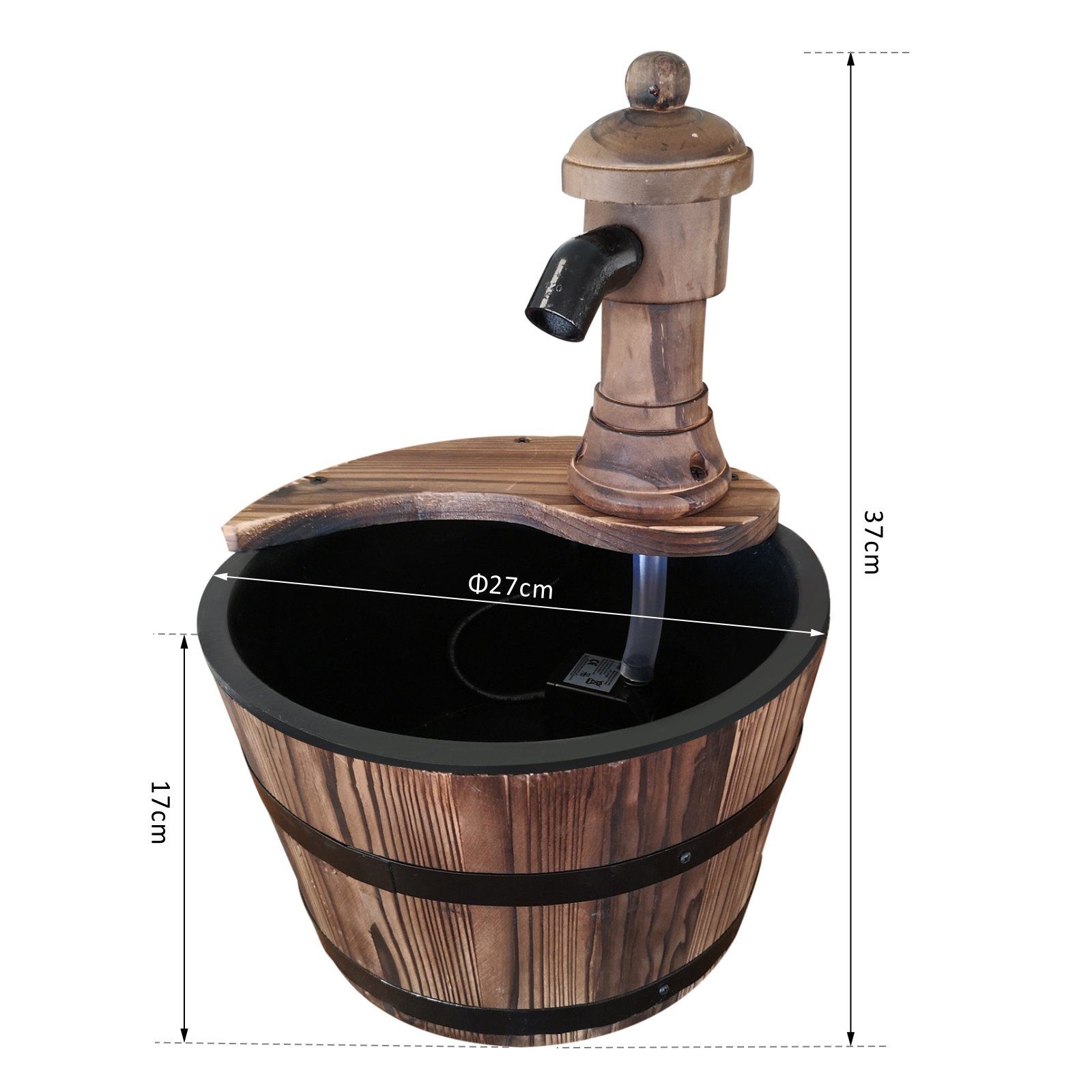 - Retro styled wood barrel fountain pump adds a unique touch to your garden and outdoor areas