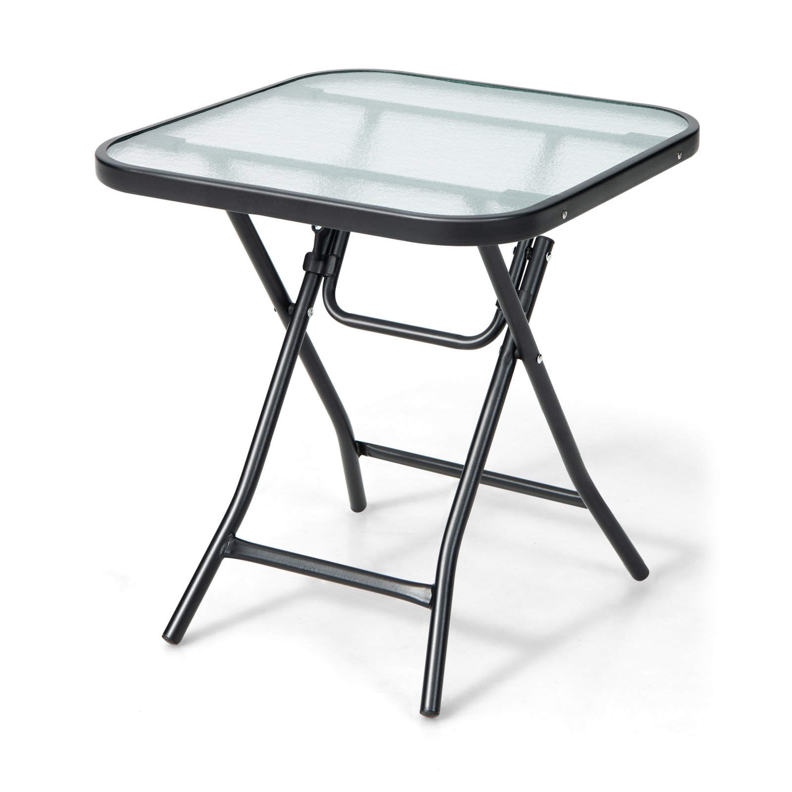 Take a comfortable bath in the sunshine and enjoy your drink and snacks time with this stylish folding side coffee table! The powder-coated finish will protect this patio side table effectively from the sunshine, making it remain initial appearance after long-lasting use. Meanwhile, the tempered glass tabletop features high density for longer service, which also offers enough space to keep your daily items within reach. Equipped with stable X-shaped frame and non-slip foot pads, our side table with excellent stability will be a perfect addition to your indoor and outdoor leisure life! Plus, the folding design makes storage and transportation effortless. Bullet Point: Folding Design for Space-saving: This patio side table with folding design makes it easy to store, which will not occupy too much space when not in use. With compact size 26.5″ x 18″ x 2.5″(L x W x H) and lightweight design, this folding table is convenient for transportation. You can take it anywhere with ease. No assembly required. Durable and Sturdy Construction: Made of heavy-duty steel frame with powder-coated finish, this portable side table is durable enough to stand the test of time. Besides, X-shaped structure and non-slip foot pads add extra stability. And the max weight capacity of the table is 110lbs. In addition, the security lock and fixing buckles ensure your safety during use. Tempered Glass Side Table: Compared with normal glass, the tempered glass tabletop is more sturdy and will not break easily. The compact tabletop offers ample space for your snacks, fruits, books and so on. Perfect Addition to You Space:Designed with simple style and clean lines, this patio side table fits well with any home decoration, which is suitable for both indoor and outdoor use. You can place it on the patio, poolside or balcony to meet your different needs. Easy to Clean & Maintain: The smooth surface is waterproof and easy to clean, you just need to wipe it with a damp cloth once the tabletop is stained. What’s more, the rounded corners protect your delicate skin from accidental scratches. Overall dimension: 18″ x 18″ x 18.5″(L x W x H).
