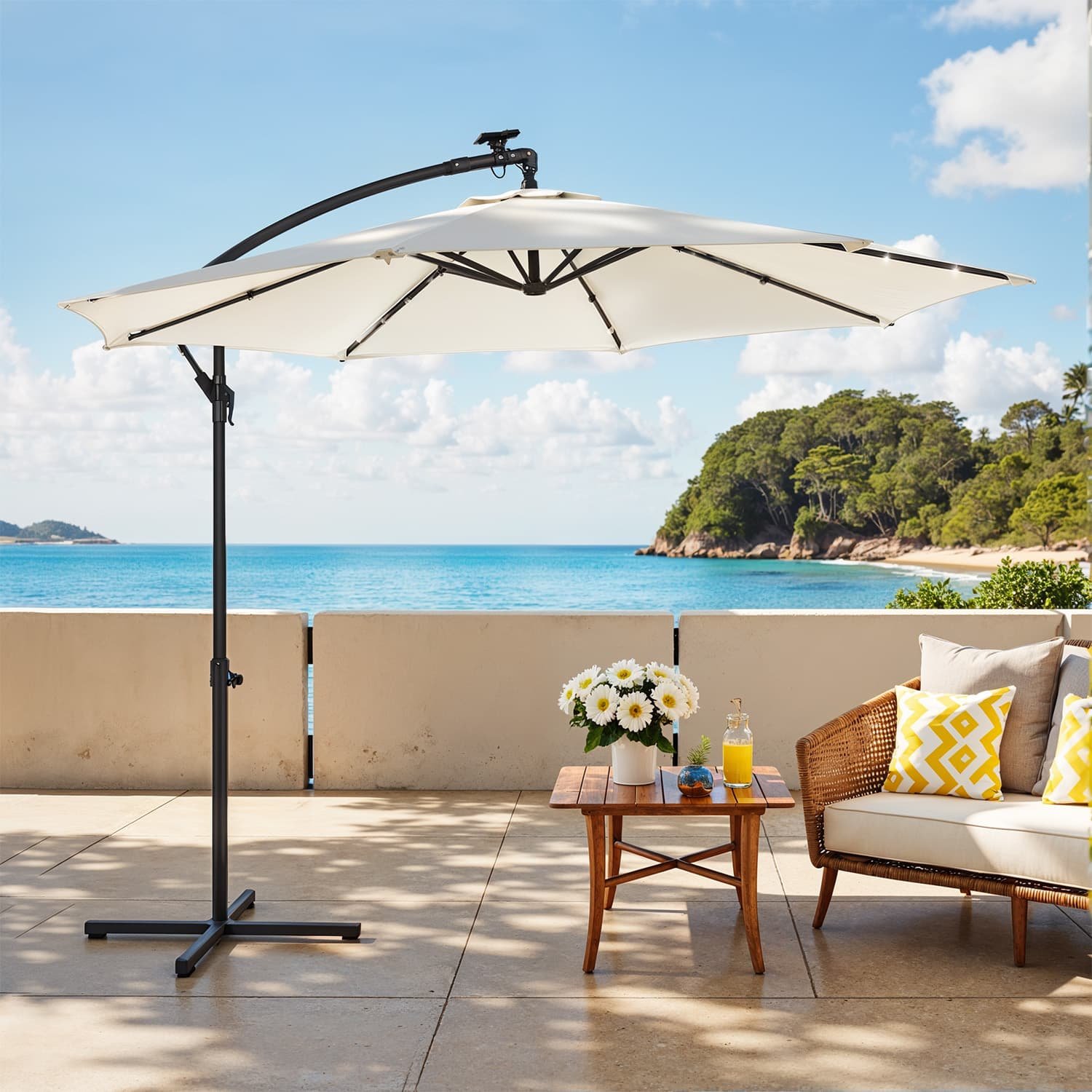 Cool by Day, Romantic by NightBrunch with friends on the terrace, a carefree afternoon with the family in your yard, a romantic dinner with your better half in the garden…this garden parasol makes every one of your ideas come true! It offers strong UV protection of UPF 50+, soft lighting thanks to 32 LED lights, and high stability in light winds. You’ll be able to enjoy the fresh air outdoors all day long!Specifications:- Colour: Beige- Material: Powder-Coated Metal Pole, 180 g/m² Polyester Fabric- Canopy Diameter: 3 m- Height: 2.45 m- Product Weight: 14.1 kgPackage Contents:- 1 x Solar Cantilever Parasol- 1 x Solar Panel- 1 x Cross Base- 1 x InstructionsSONGMICS Notes:- Add weights of 70-90 kg (not included) to your existing umbrella stand to enhance overall stability.- Do not open the umbrella with force, the crank mechanism needs a slow and light opening.- Close the parasol during nights, windy or rainy days to avoid damage to the product.