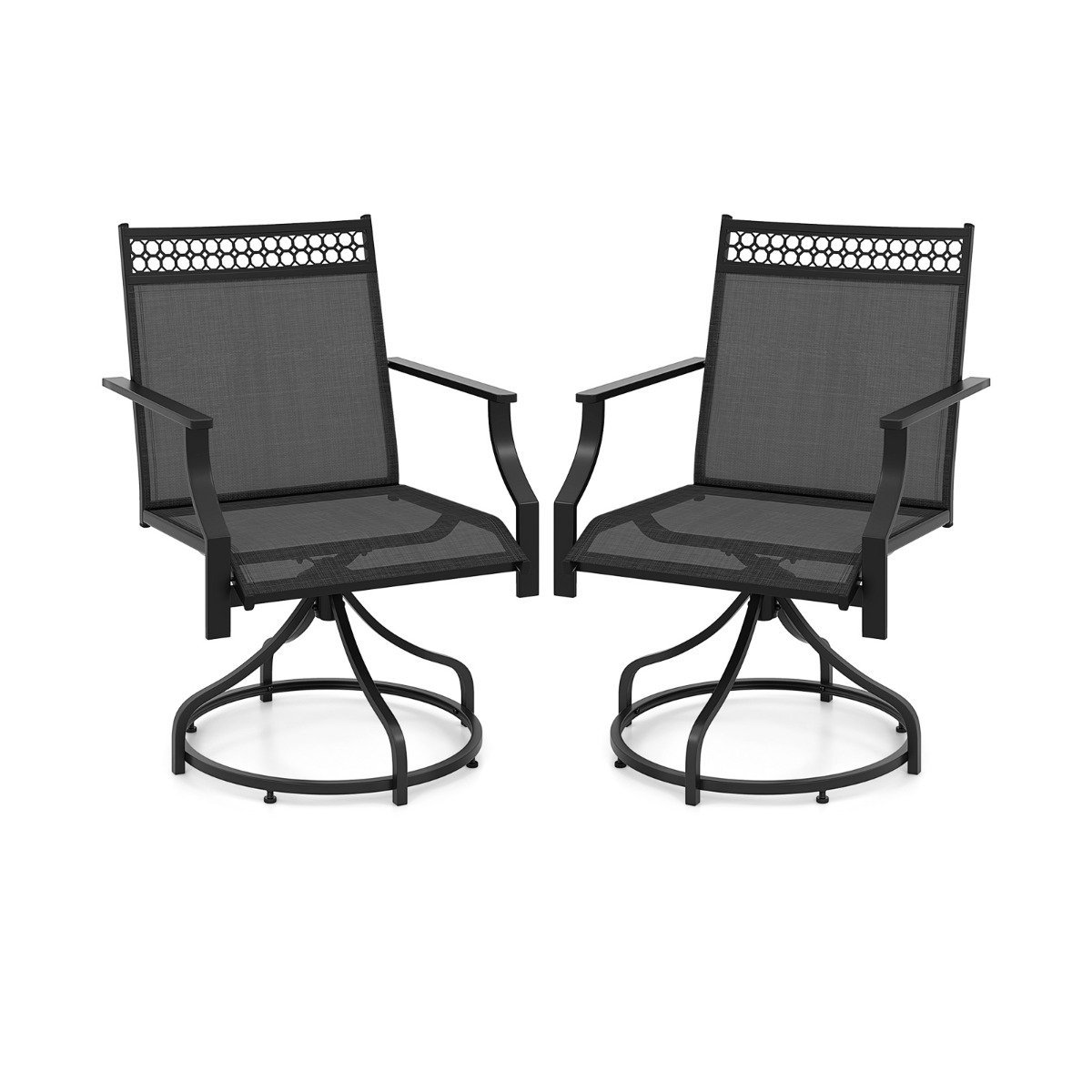 These elegantly designed patio chairs feature a 360-degree swivel for seamless conversation, complemented by a sturdy metal frame for lasting durability. In addition, the outdoor dining chairs’ quick-drying and breathable fabric ensures comfort and ease of maintenance, while the contoured seats provide ergonomic support for those long, leisurely meals. Swivel Convenience: The 360° swivel motion endows these patio dining chairs with great convenience, which allows you to effortlessly turn in any direction to join any conversation or simply find the perfect angle for sunbathing. High-quality Fabric: The premium fabric of these patio chairs is quick-drying and wear-resistant for better outdoor performance and longevity. Moreover, the fabric also provides you with a breathable sitting experience. Optimal Comfort: Featuring ergonomic backrests and contoured seats, these outdoor chairs are perfectly shaped for your body’s natural curves. Additionally, the armrests bring added comfort. Sturdy Construction: Each patio swivel chair is constructed of heavy-duty metal frame with stable 4-legged structure, which ensures strong loading capacity up to 180 kg for stable and reliable support. Wide Application: Designed with elegant lines and modern silhouette, these outside chairs add a touch of sophistication to your outdoor settings, including porches, lawns, gardens and backyards.
