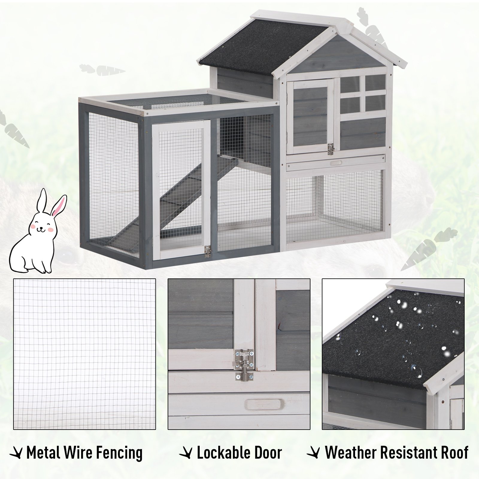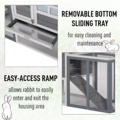 This outdoor rabbit cage from PawHut is perfect for use with rabbits, guinea pigs, and other small animals. This great 2-story rabbit playpen features sturdy construction from Fir wood coated with a water-based preservative to ensure long-lasting use whether used indoors or outside in the elements. This rabbit starter kit hutch has a sturdy steel wire outdoor run for your pets to run around as well as an enclosed space for them to be able to sleep indoors. The outdoor run area accessible by a ramp so your pet can enjoy the outdoors while still being protected from the elements and predators. There are 2 easy to open doors to gain quick access to your pets, one is able to open up the outer run area and the other is to open the inner loft area. The large main living area has a removable pull-out tray to make cleaning simple and quick.
