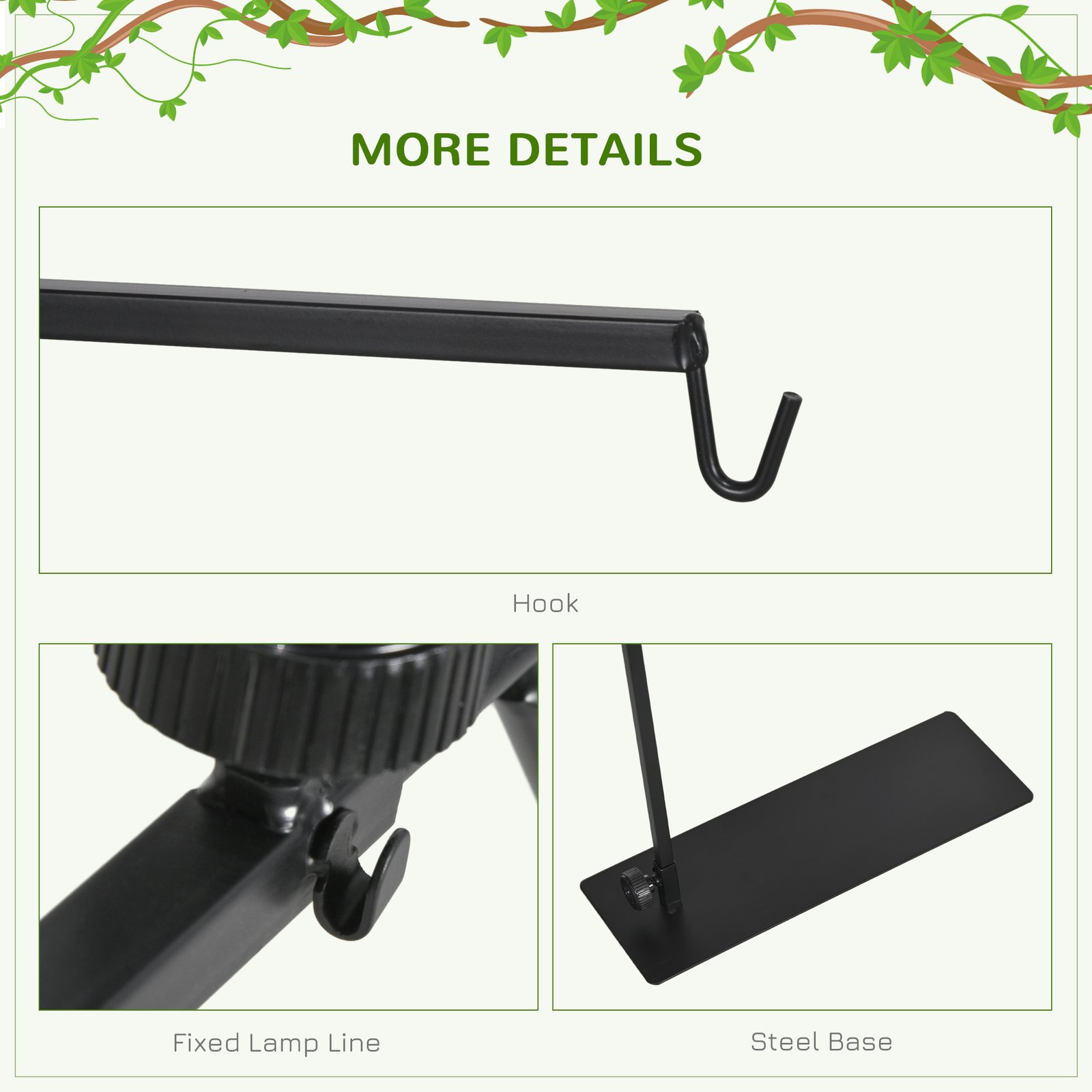 - Includes a steel hook for the lamp to hang securely