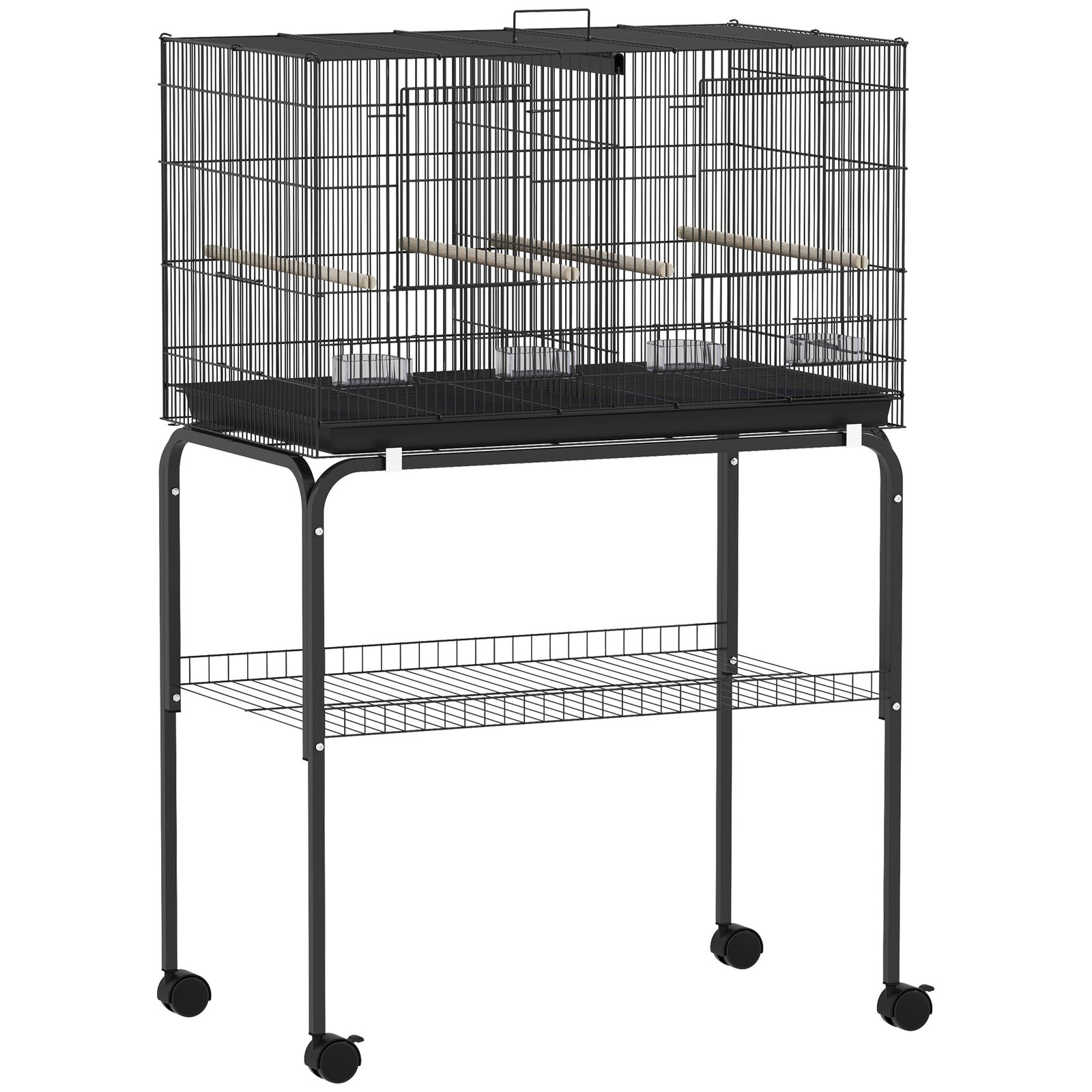 PawHut Bird Cage with Divider, 4 Wooden Perches, Slide Out Tray, 4 Feeders, for Budgie, Lovebird, Canary, 76 x 46 x 116cm Black