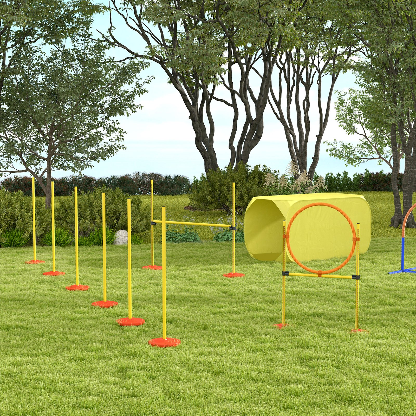 • SET OF 4 OBSTACLES: This pet training set features a variety of equipment types with high jump, tunnel, swerving around poles, and jumping ring.