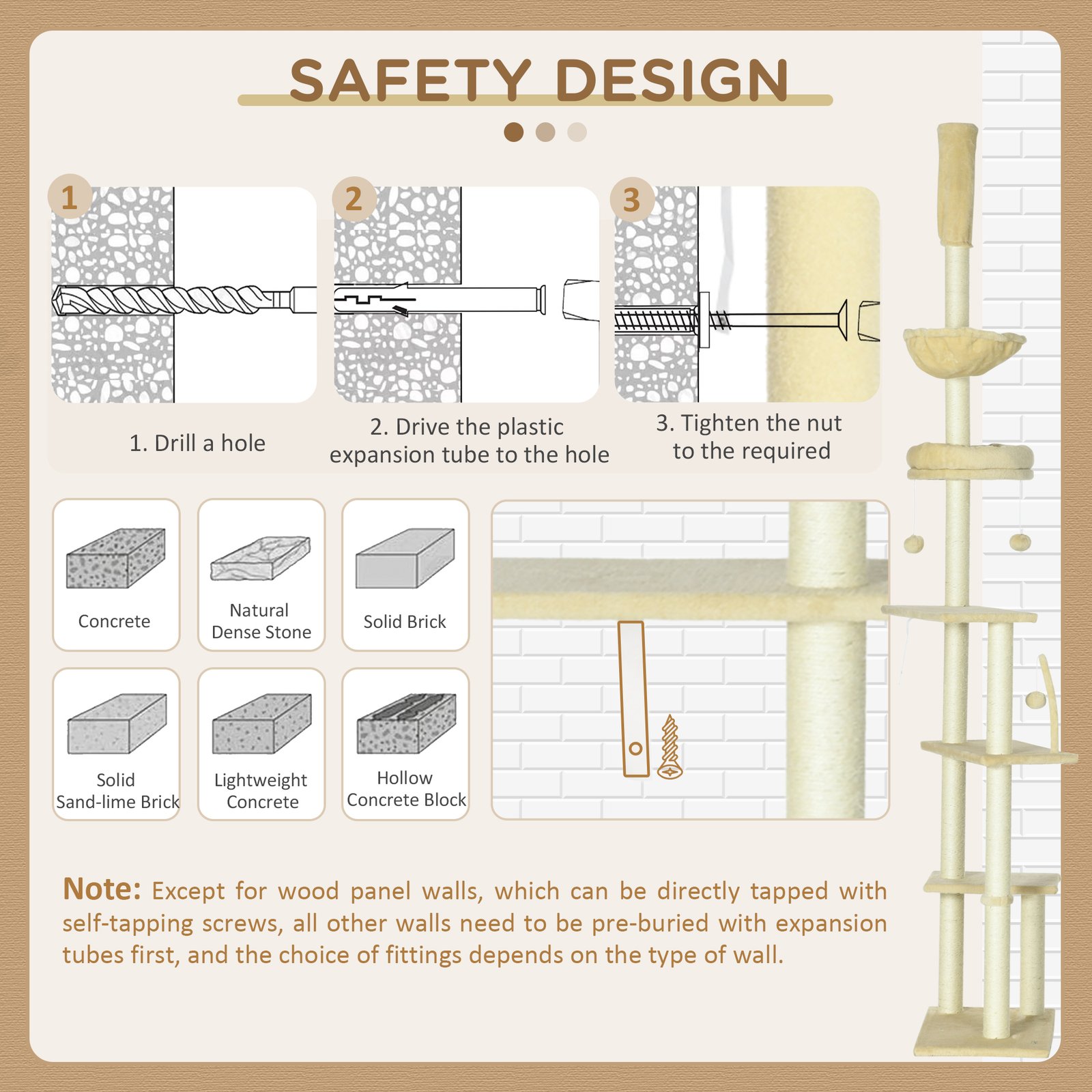 - Note: This cat tower needs to be attached to the ceiling for added safety and is designed for ceilings under 250cm in height.