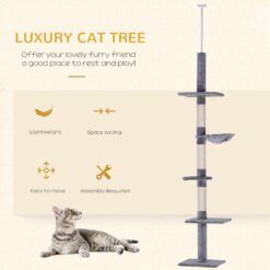 PawHut Floor to Ceiling Cat Tree 230-260cm Height Adjustable, 5-Tier Cat Tower with Scratching Posts, Hammock, Perches, Climbing Activity Centre for Indoor Kittens Playing and Relaxing, Grey