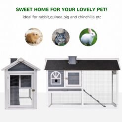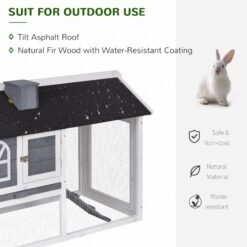 This outdoor rabbit cage from PawHut is perfect for use with rabbits, guinea pigs and similar sized animals. It gives a mix of living space – the upper house offers them a private area, whilst the lower area gives them open space for free movement. Lockable doors and the slide-out tray provide easy access for cleaning, feeding and other tasks. Finished with an asphalt roof to keep inside dry from light-medium rain.