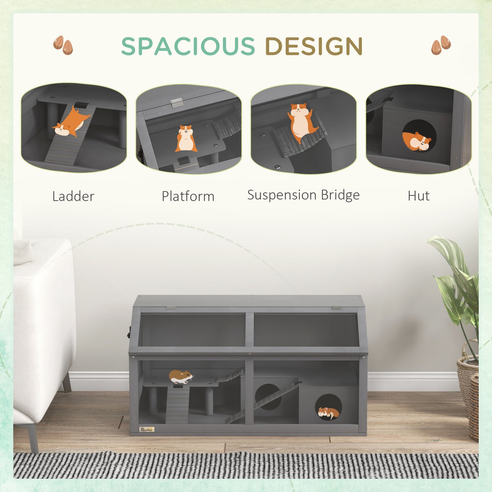 A home for small pets to love, this PawHut hamster cage includes a suspension bridge, a hut, ladders and a platform, allowing hamsters to indulge in endless fun and exploration. Thanks to its spacious design, you can place wood shavings for pets to burrow and play in. Plus, the openable top door provides easy access, whilst having a designated space for storing hamster essentials. It’s a cosy retreat filled with adventure and excitement, elevating pet happiness.