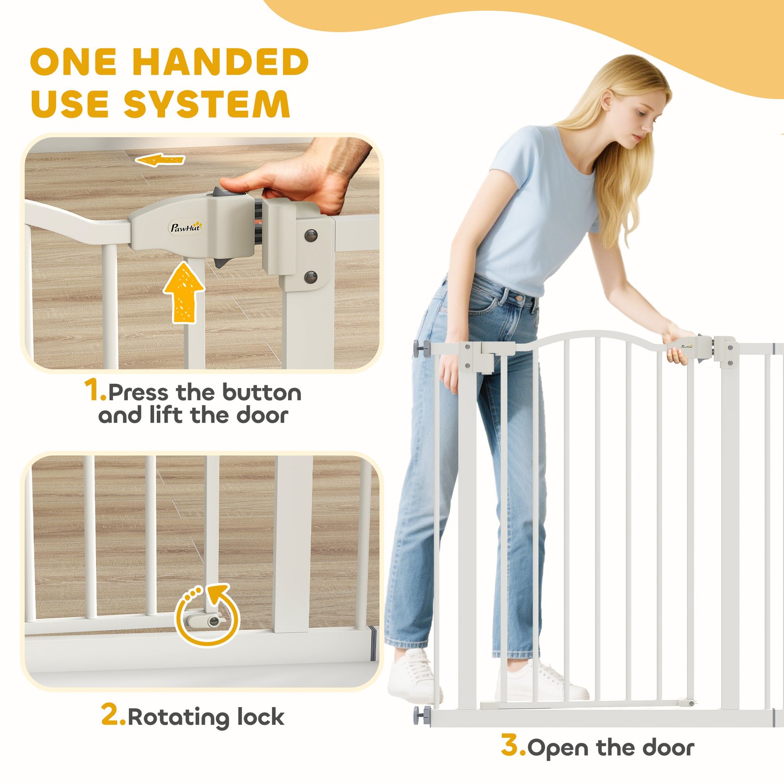 • METAL FRAME: A solid structure that keeps the stair gate standing properly in place. Spray-treated finish for extra strength and protection.
