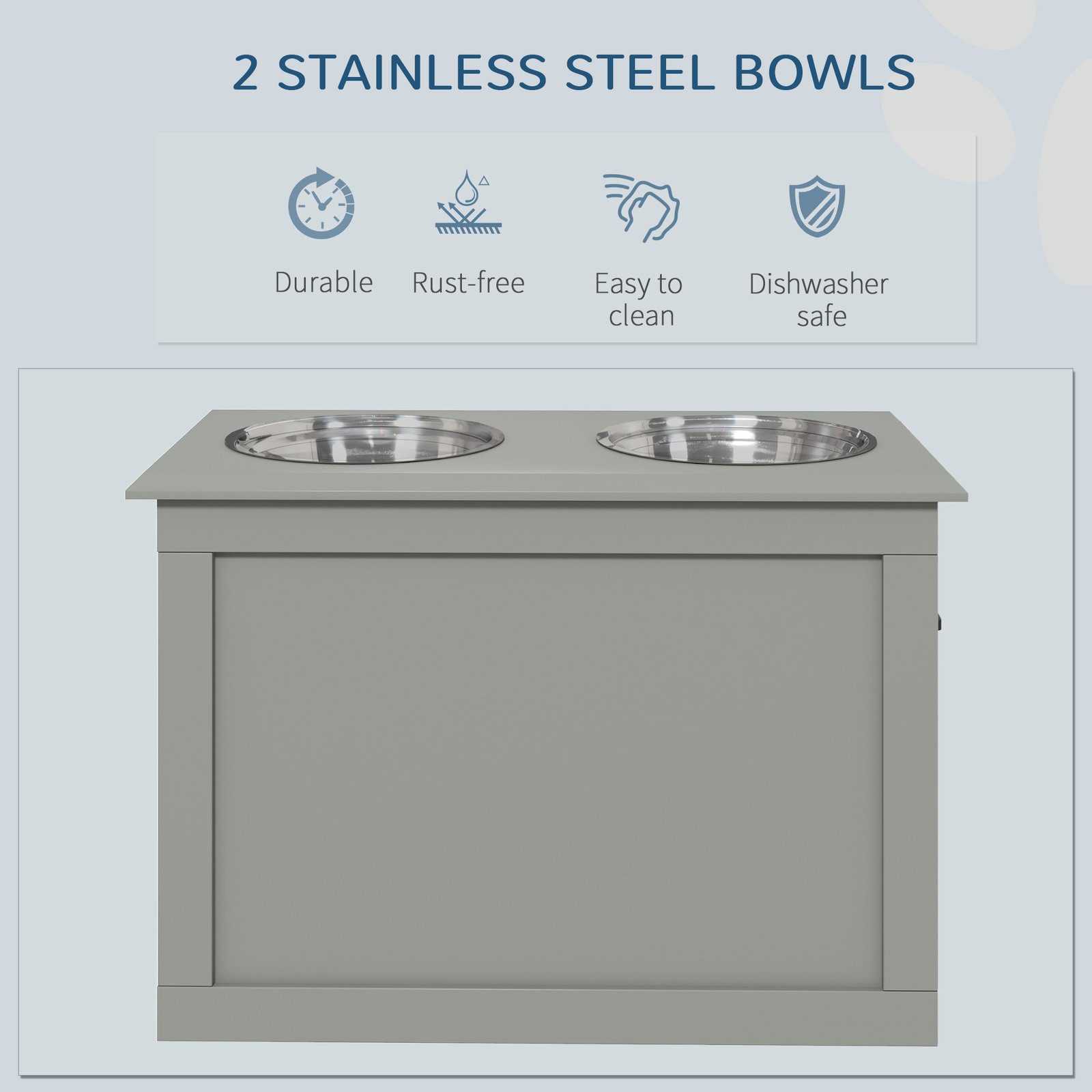 - Two removable stainless steel bowls for food and water