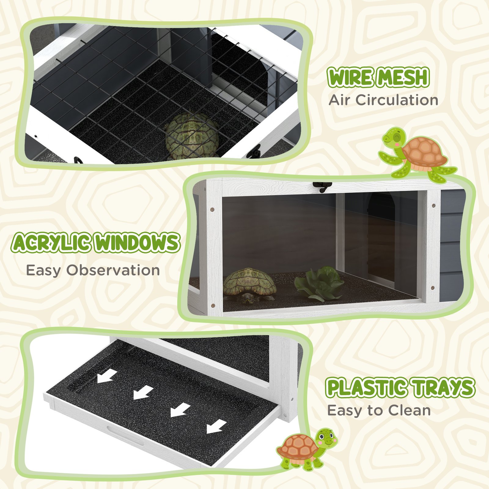 Introducing the PawHut two-room tortoise house a wonderful habitat for reptiles. With a roomy living space and an expansive run area, it’s great for roaming and basking. Achieve the right temperature with the adjustable lamp holder. Cleaning is a breeze, thanks to the double pull-out tray and openable lids, simplifying pet care. Elevate your pet’s lifestyle with this delightful home, designed to foster their well-being, allowing them to thrive.